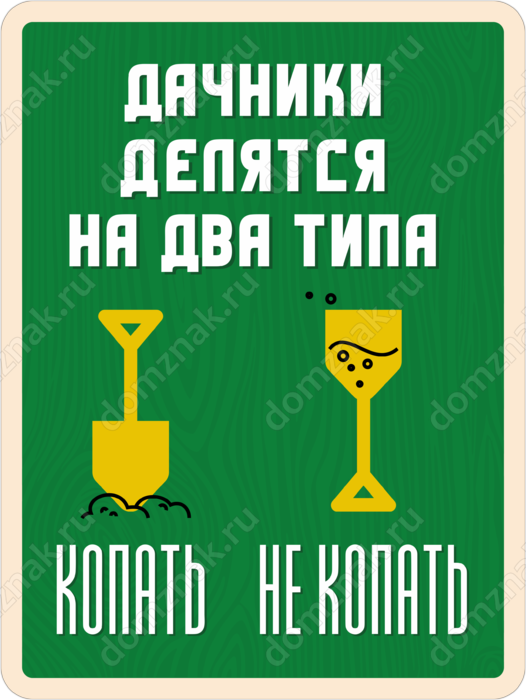 Табличка «Дачники делятся на вида типа: копать, не копать.» изготовлена из пластика ПВХ, толщиной 4 мм. Изображение наносится по технологии УФ-печати. Табличка предназначена для использования как в помещении, так и на улице.