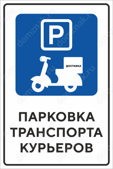 Вы можете заказать Знак «Парковка транспортов курьеров» по индивидуальному дизайну или воспользоваться готовым вариантом от нашей компании.